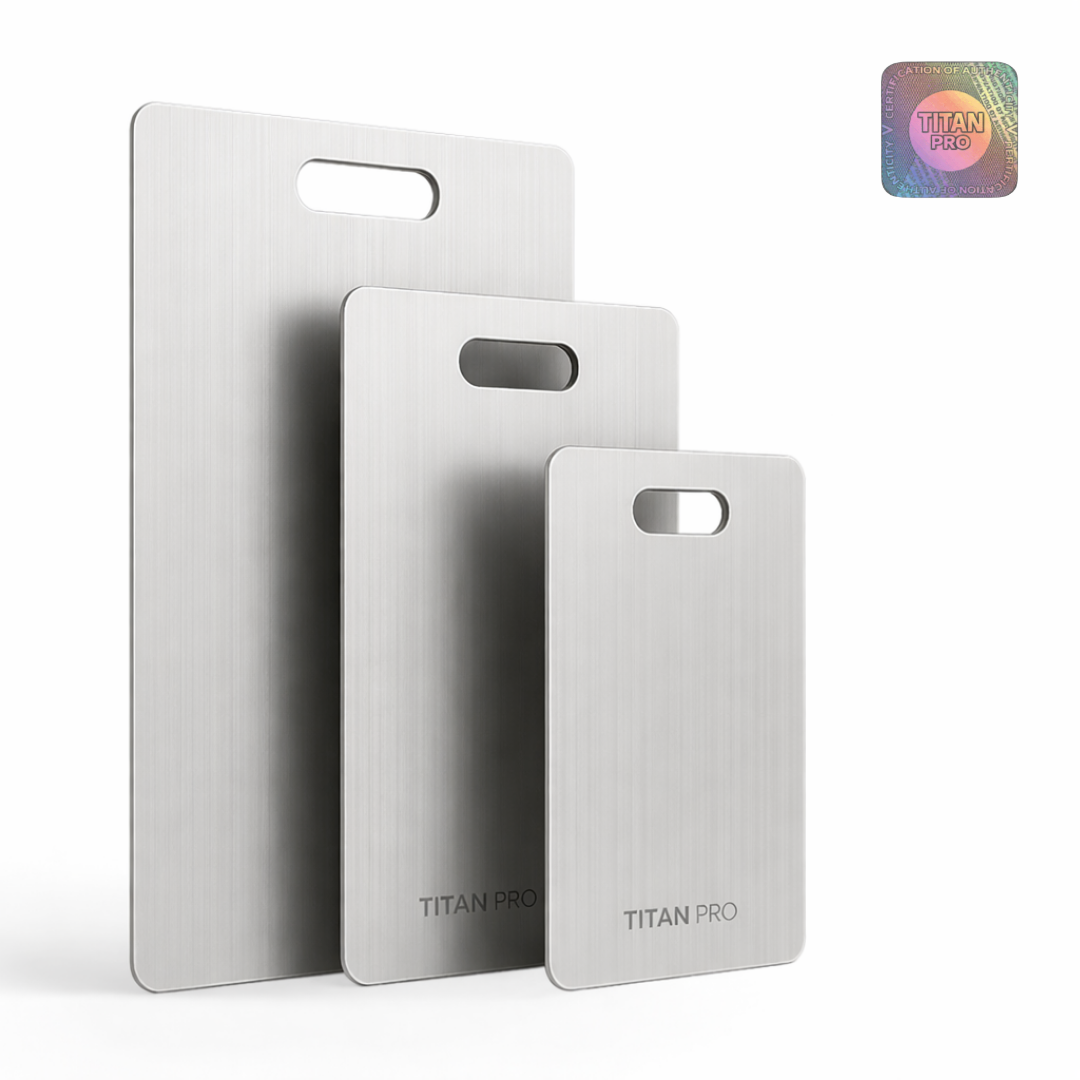 No todas las tablas de “titanio” son iguales. Titan pro está fabricada con titanio 100% puro de grado médico — sin aleaciones baratas ni trucos de marketing.